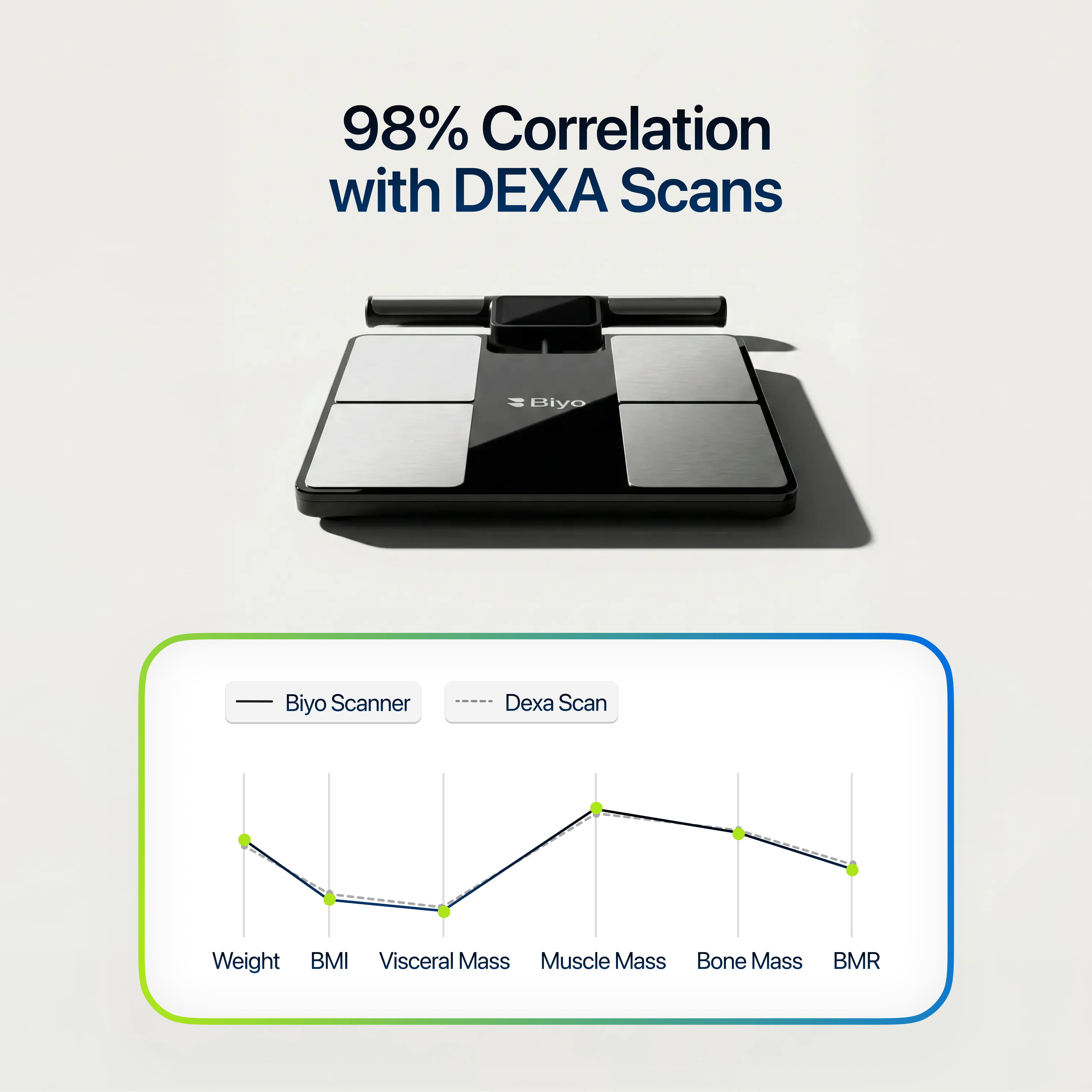 Biyo delivers body composition readings that are up to 98% as accurate as a DEXA scan, without radiation, lab visits, or appointments.